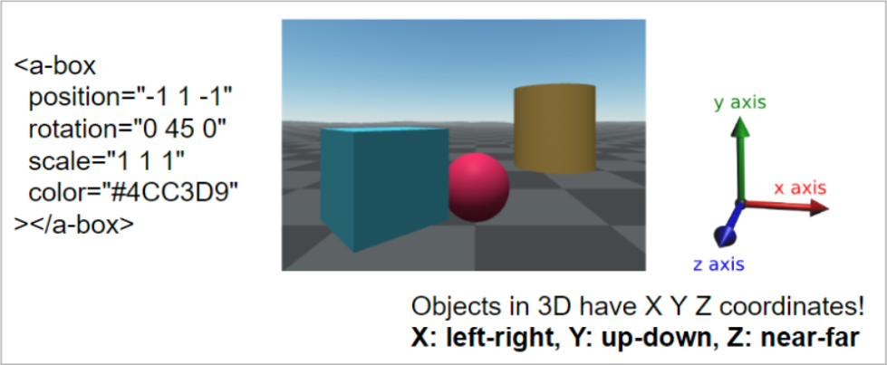 The position, rotation, and scale attributes use X Y Z notation. Position moves an entity (in meters), rotation spins it like a top (0 to 360 degrees), and scale makes it bigger in each direction (# times bigger).