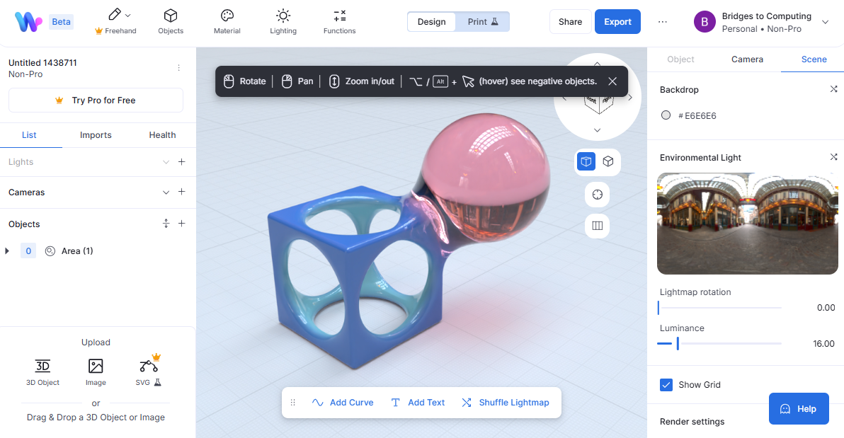 Go to beta.womp.com and click on "Sign in with Google". Womp is a 3D modeling tool that runs in your web browser.