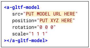 In HTML, create a new a-gltf-model with a src attribute.